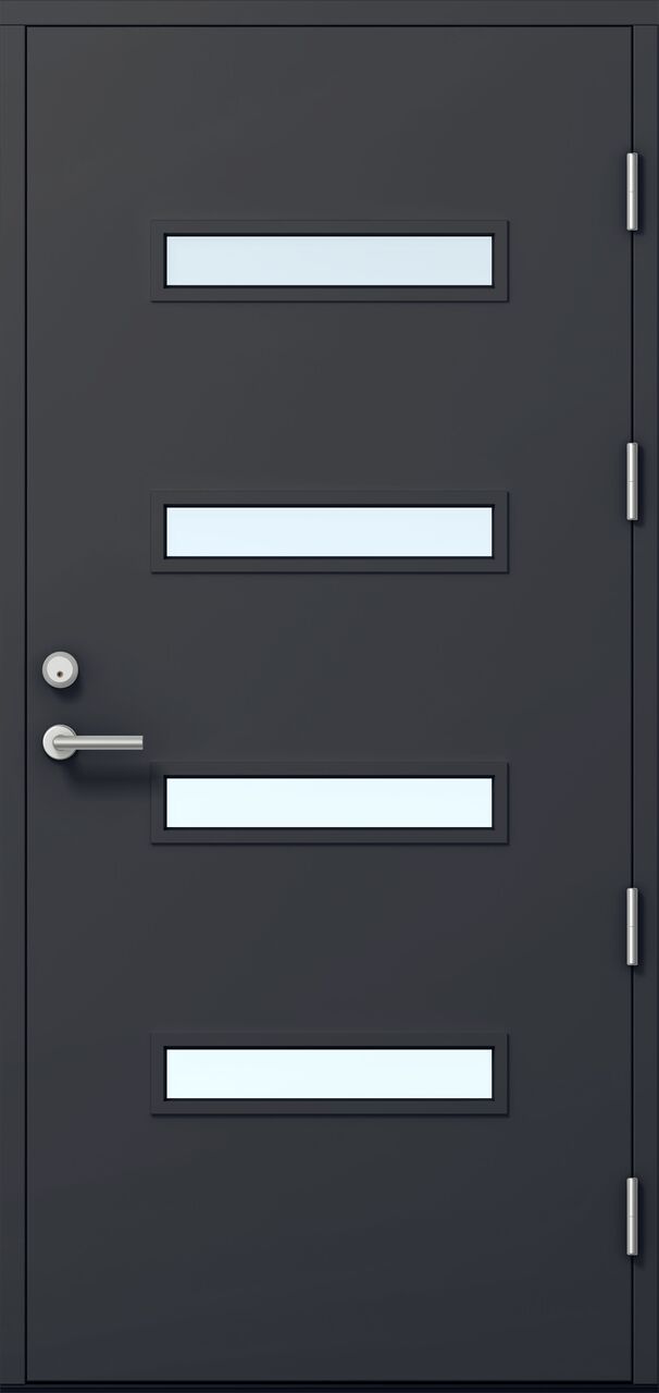 Ovilevy | EPS-lämpöeristetty 86 mm vahva ovilehti. Ovilevyn reunalla liimapuun ja kertopuun yhdistelmä sekä molemmat oven pinnat on alumiinilevyin vahvistettu. Oven pinta säänkestävä HDF-pinta tummanharmaa RR23. Ulko- ja sisäpuolelta sileä.