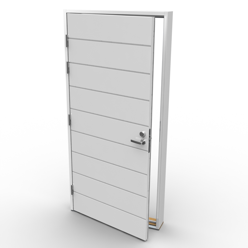 1-lehtinen, ulospäin aukeava levyrakenteinen ulko-ovi.